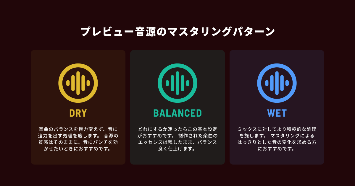 生成された3パターンのマスタリングプレビューを比較し、自分の好きなパターンを1つ選択します