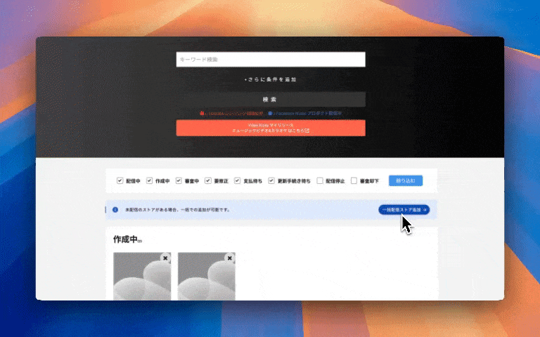 新しい配信ストア、未配信だったストアへの追加申請を全作品まとめて実行できます。1リリースずつ追加する手間を省き、リリース管理の効率が大幅に向上します。