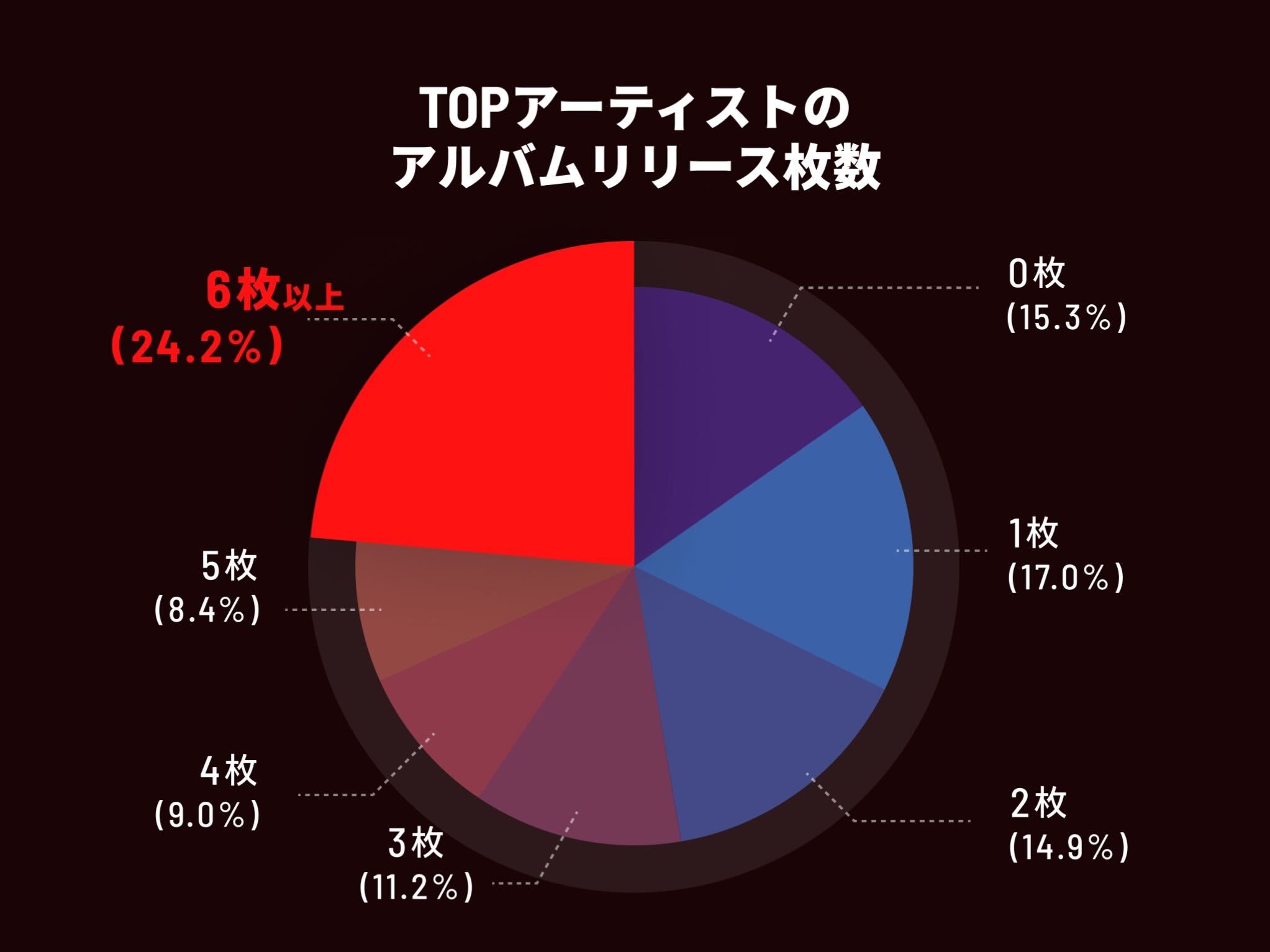 グラフから分かる通り、TOPアーティストの約85%はアルバムのリリース経験があり、そのうち約25%は6枚以上もリリースしています。 つまり、シーンの最前線で活躍するアーティストのほとんどが、継続的にアルバムを発表しているのです。