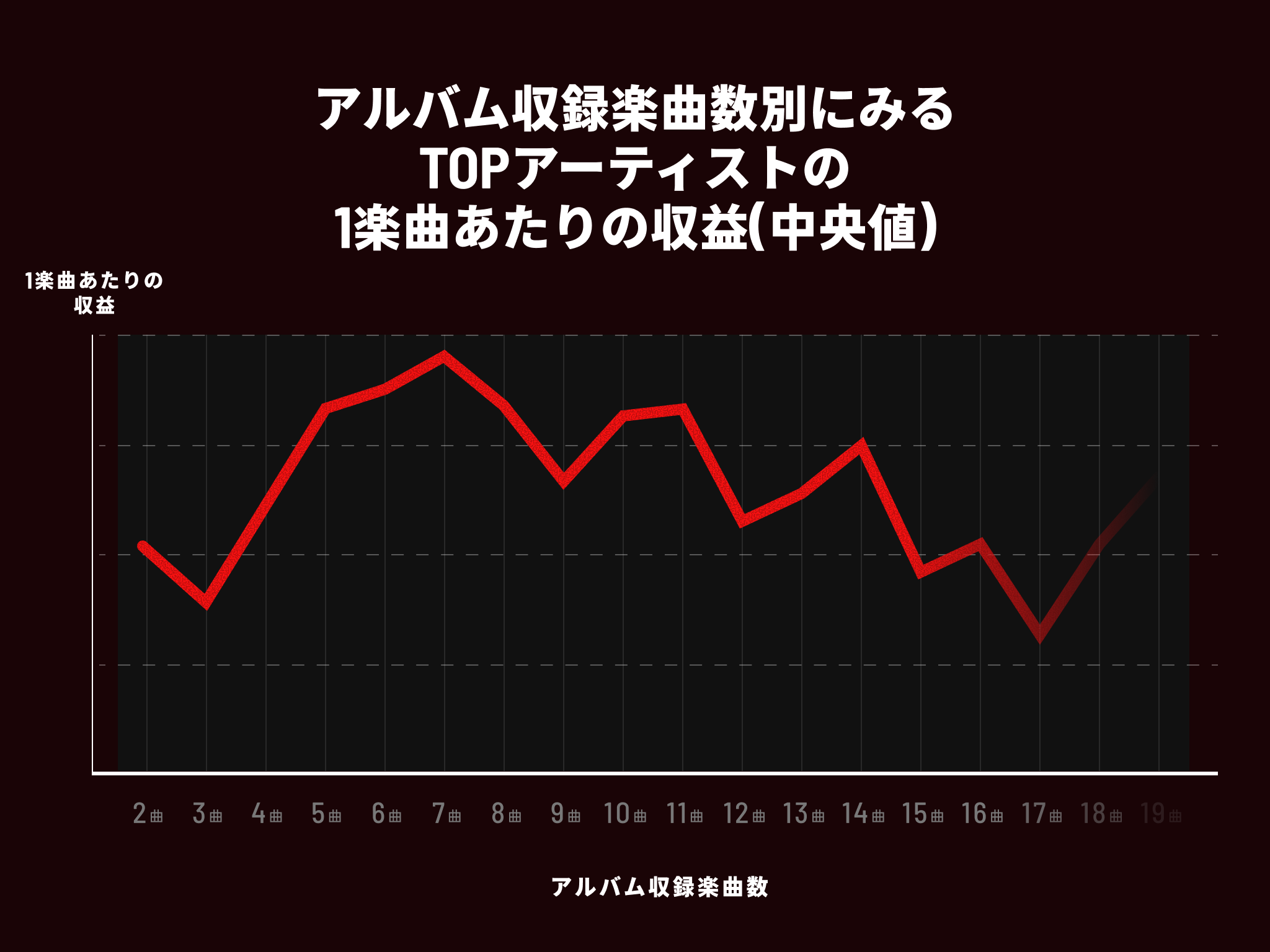 グラフを見ると3曲目以降収益が伸びていき7曲目が最も高い収益を示しています。 また、収録楽曲数が少なすぎるもしくは多すぎると収益が低い傾向にあることが確認できます。