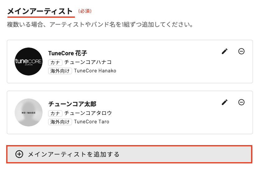 楽曲情報編集画面でメインアーティストの項目に、関わる全てのアーティスト名をメインアーティストとして追加します。この方法で登録すると、配信ストアではアーティスト名が「アーティストA & アーティストB」や「アーティストA , アーティストB」といった表記になります。