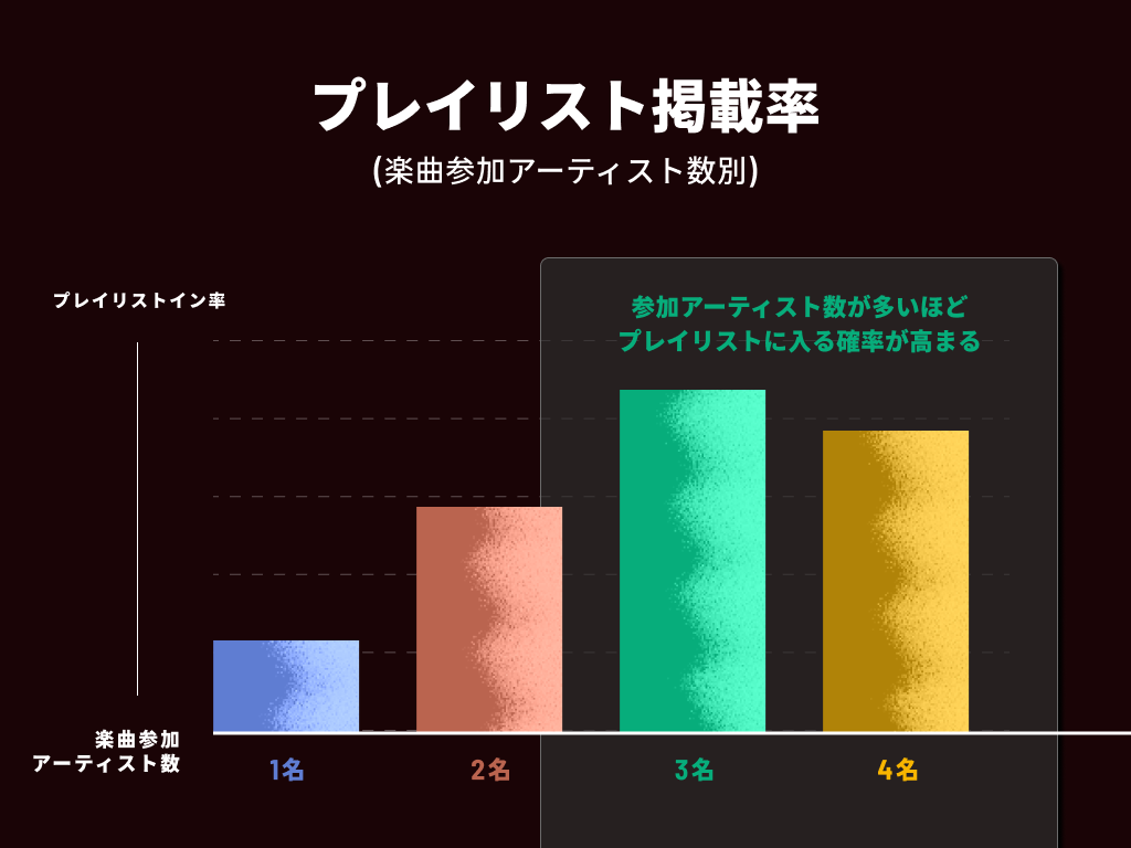 参加アーティストが1名の楽曲と比較すると2名、3名と増えるにつれ配信ストアのプレイリスト掲載率が大きく上昇します。プレイリストに入ることのメリットについてはこちらの記事をご覧ください。