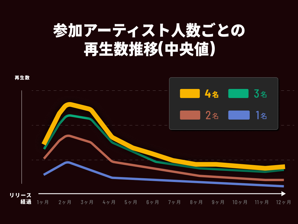 グラフから分かる通り3名、4名と参加アーティストが増えるにつれて再生数は増加し、特にリリースから1〜3ヶ月目までで顕著な差が出ています。このデータから参加アーティストが増えることで、それぞれのファンベースにリーチされ、初動の勢いが生まれていることを示唆しています。また、SNSでの話題性、そして参加アーティストがそれぞれのライブで披露することでの露出回数の増加など様々な広がり方によって楽曲の認知度が高くなっていきます。コラボレーションは楽曲の再生数を伸ばす上で、重要なプロモーションの戦略と言えます。