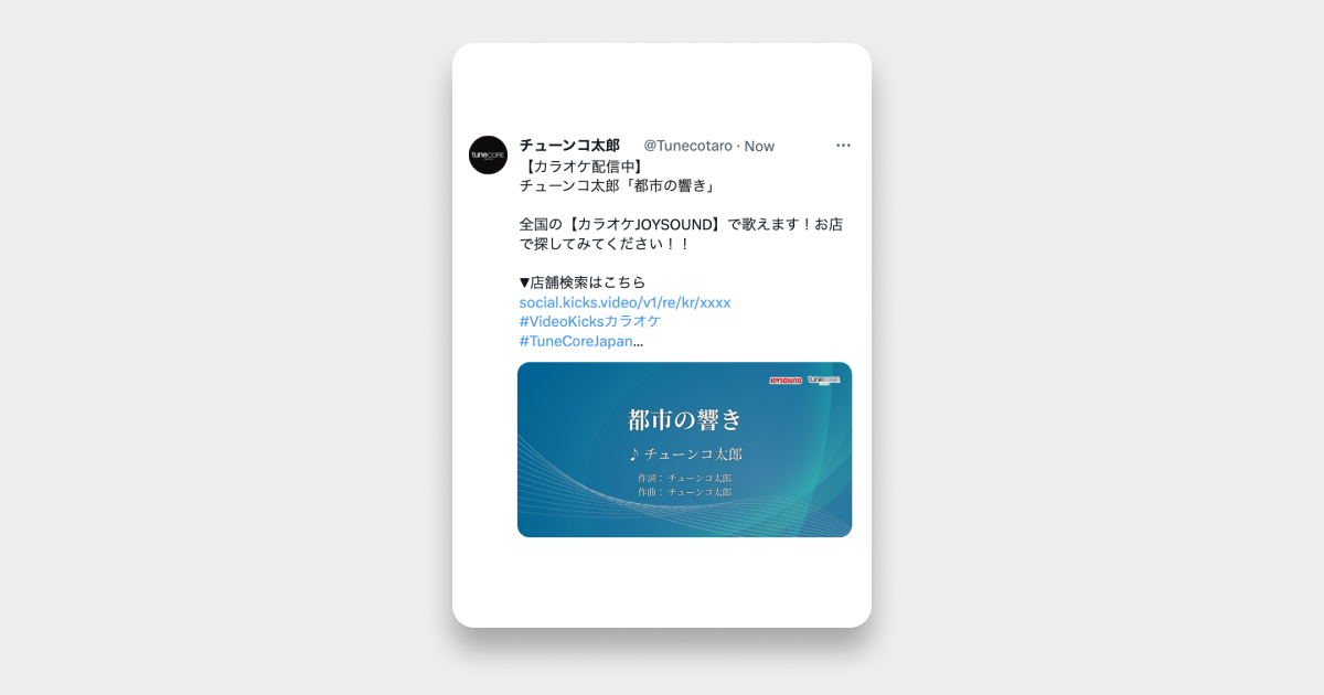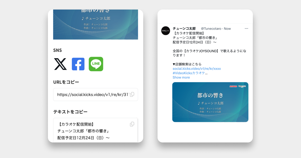 カラオケで好きなアーティストの曲が歌えるのは特別な体験になり得ます。 シェア機能を使ってカラオケ配信プロモーションに役立てましょう。