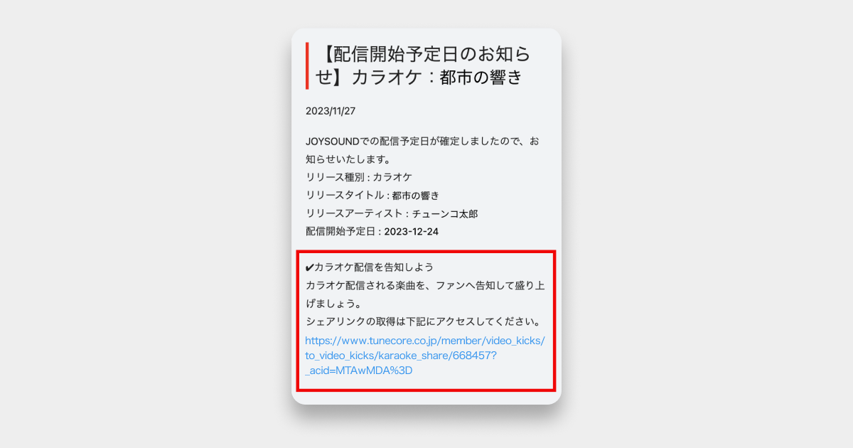 カラオケ配信申請を行い、カラオケの配信開始予定日が確定すると、「管理者へのお知らせ」に通知がきます。お知らせに記載の ✔︎カラオケ配信を告知しよう からシェアリンクを取得して、簡単に告知をすることができます。