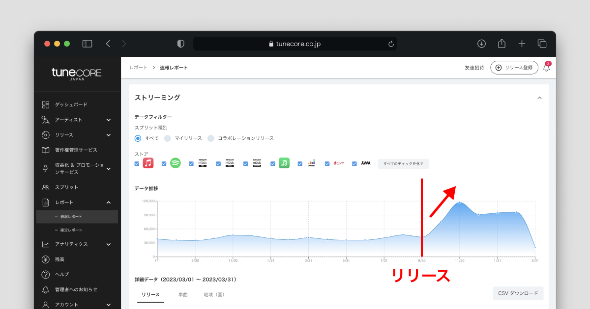 「リスナーを増やす」ためには、なにかしらアクションを起こし、それらがどれくらい影響があったかを把握できる環境がある、ということが必要です。あなたの音楽を知ってくれて、聴いてくれる人がいるということは、 速報レポートグラフが右肩上がりになります。