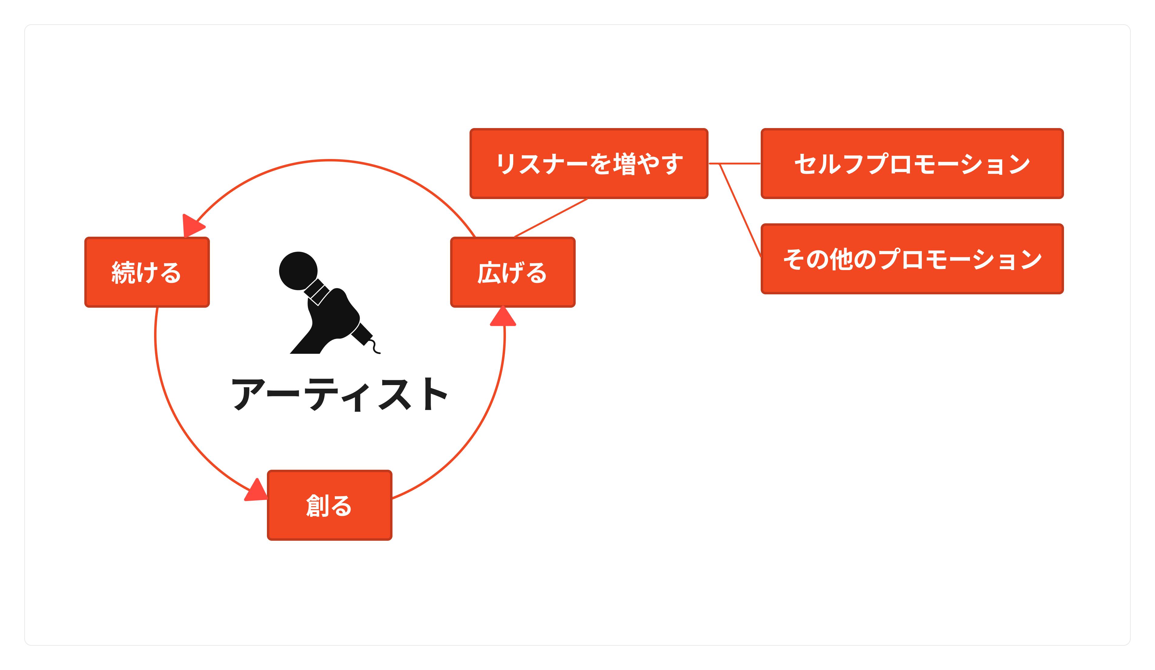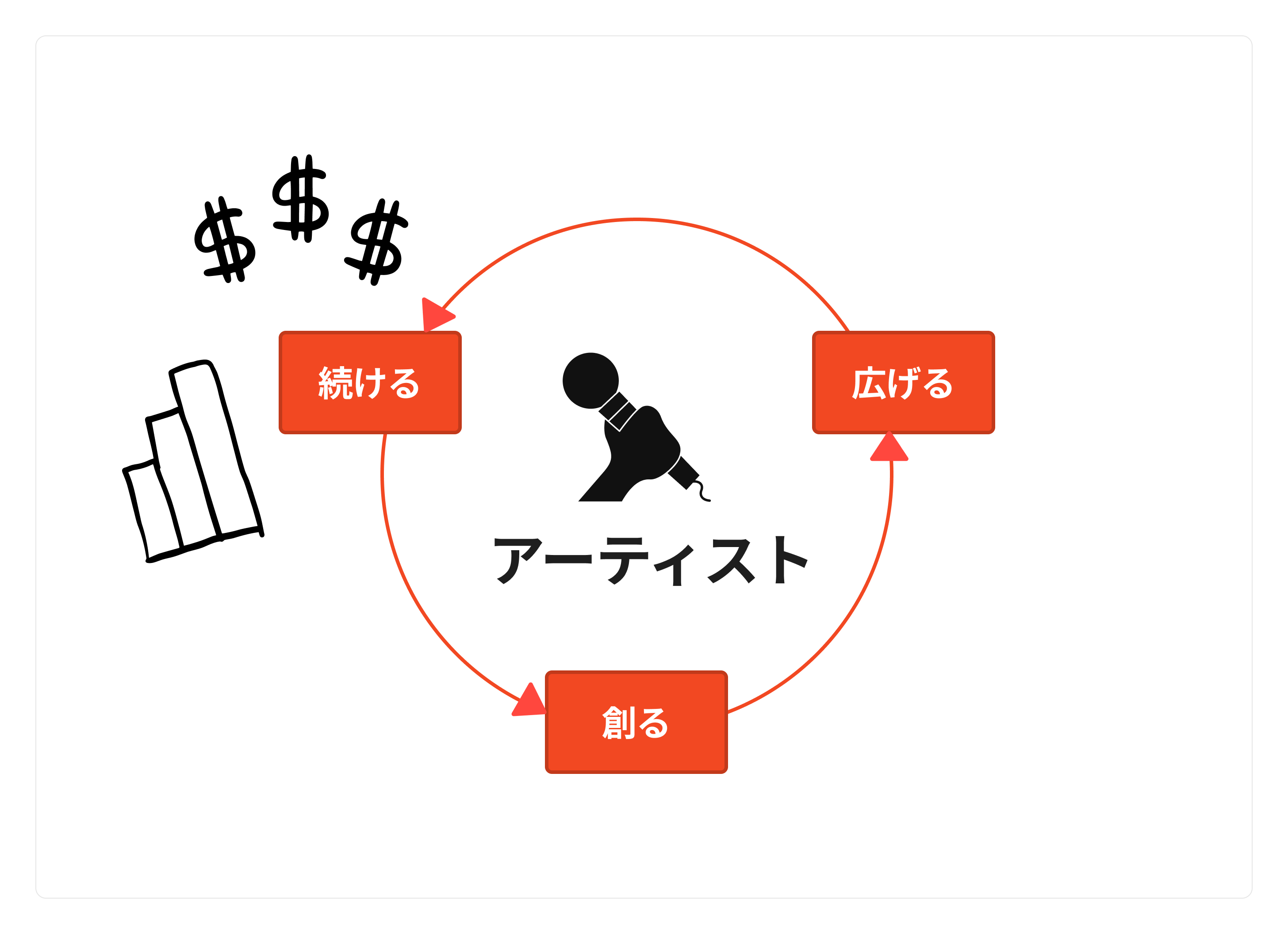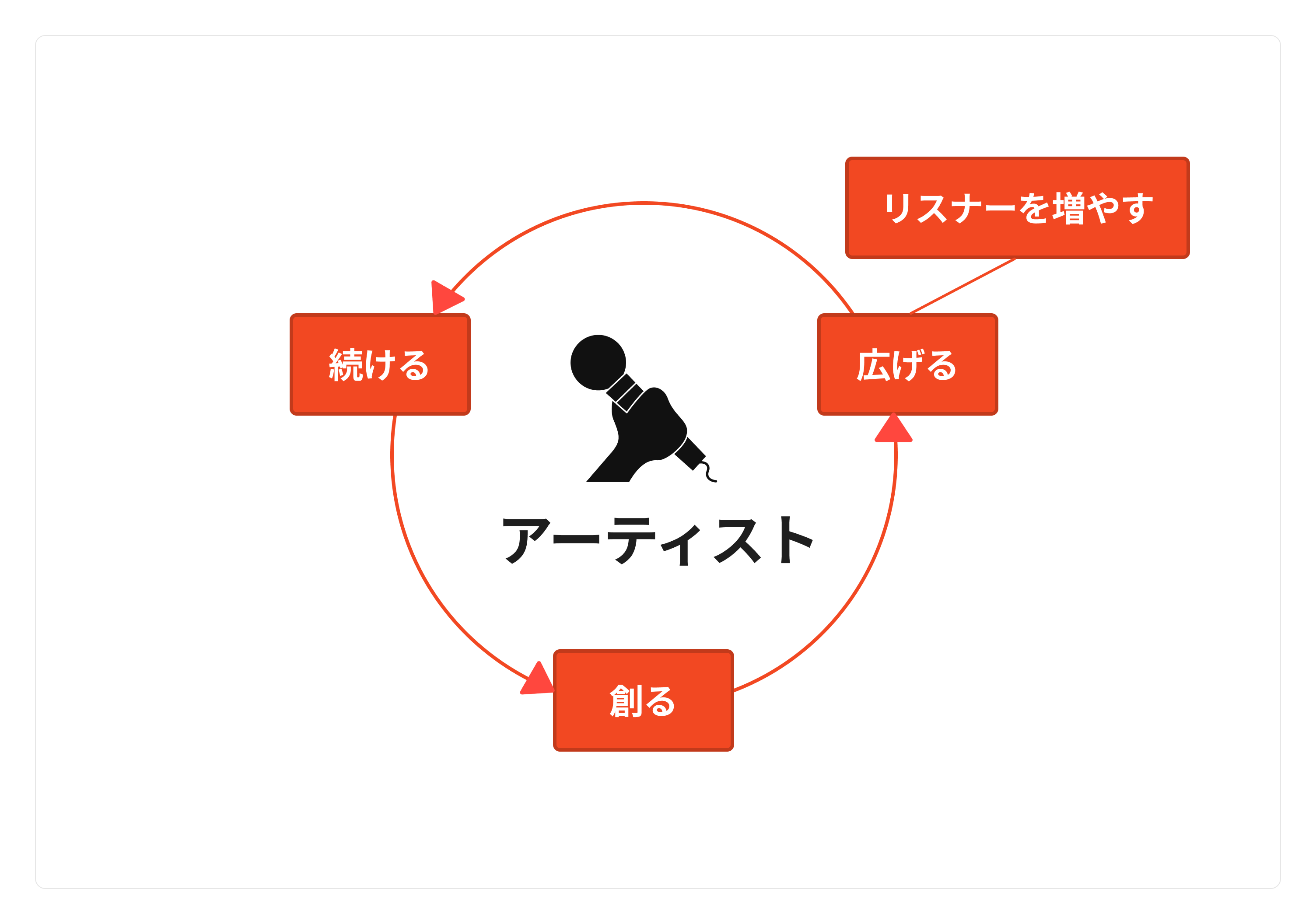 アーティストガイド「リスナーを増やす」シリーズでは、アーティスト活動の軸となる、音楽を「創る」→「広げる」→「続ける」という循環をベースに、学生でもわかる!を目指して、できるだけわかりやすく伝えていきたいと思います。