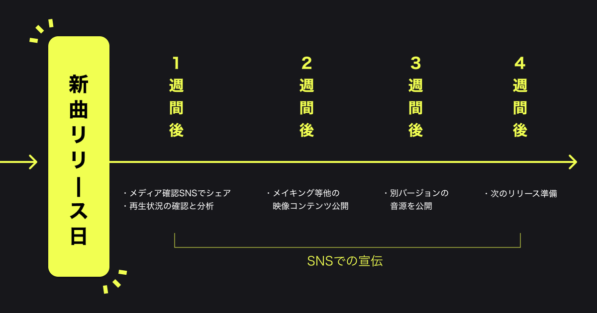 リリースした後に、メディアやプレイリストへ展開してもらえたり、ファンにしっかり聞いてもらえる環境を作ったりするためには、少なくともリリースの4週間前からの動き始めが必要となります。