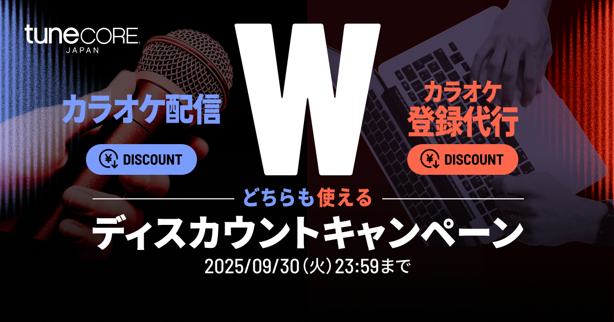 TuneCore Japanでは9月16日から9月30日の期間、最大¥4,400(税込) お得になる、カラオケ配信&登録代行 ダブルディスカウントキャンペーンを実施します。 本キャンペーンでは、カラオケ配信1年間/カラオケ配信登録代行1年間の…
