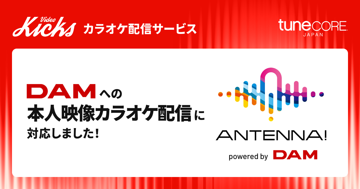 あなたのミュージックビデオをカラオケの大画面で! このたび TuneCore Japan は、「Video Kicks ビデオ配信サービス カラオケ配信」において、「ANTENNA! powered by DAM」への本人映像カラオケ配信に対応いたしまし…