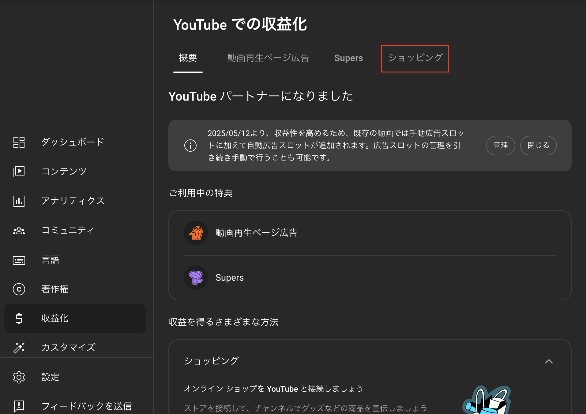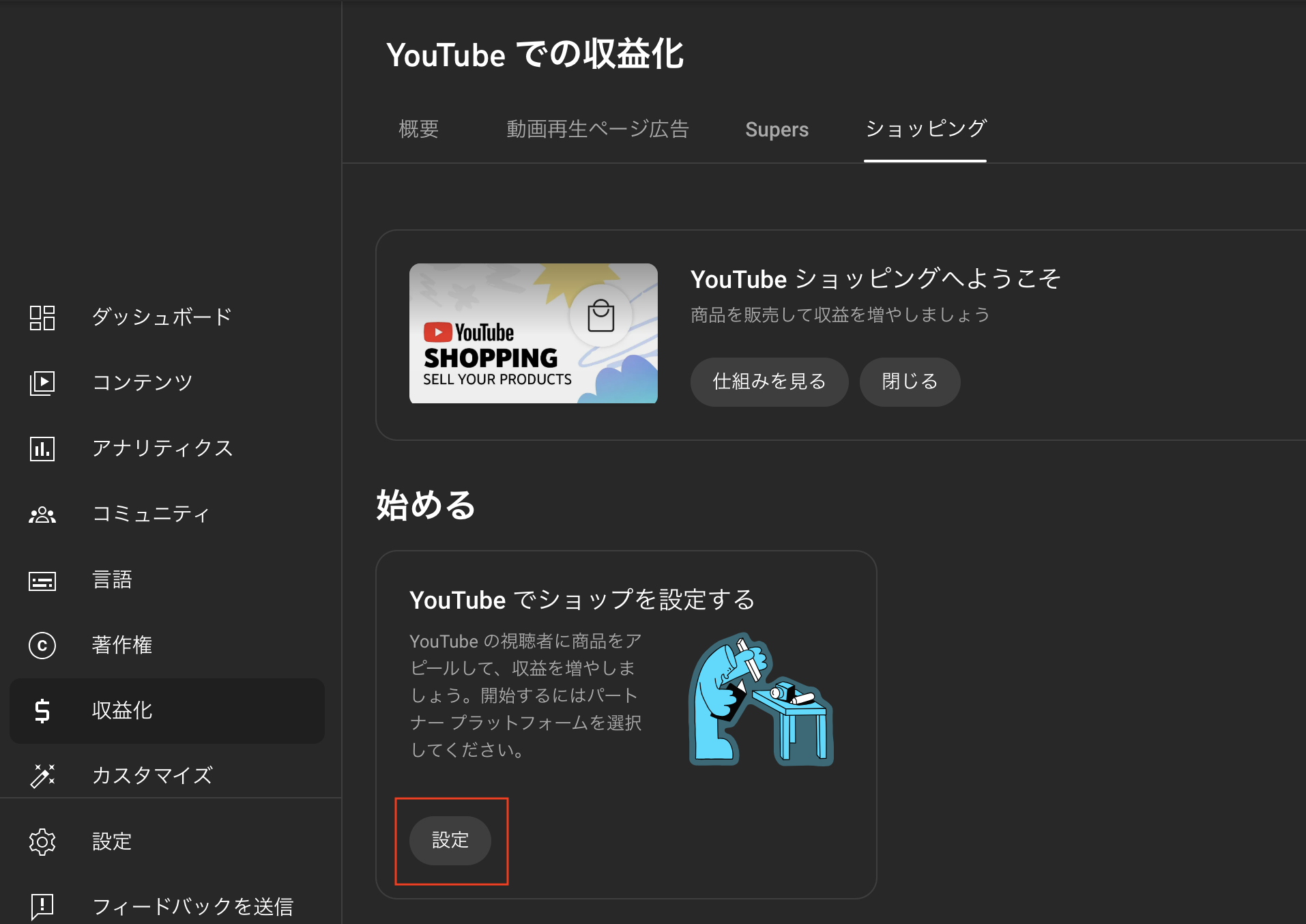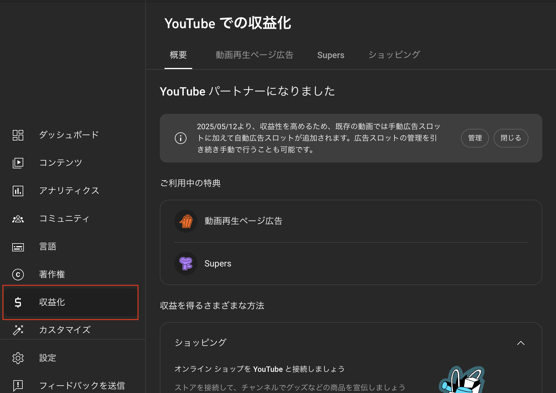 - 左側のメニューで [収益化] を選択
