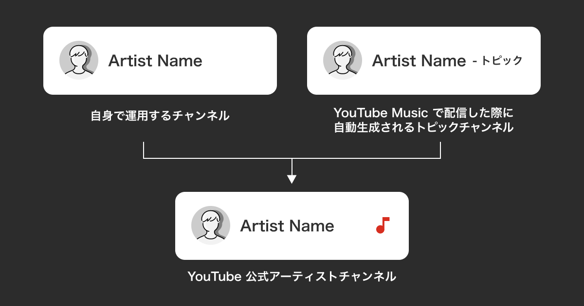 - アーティストのYouTubeチャンネルとトピックチャンネルを統合による一元管理