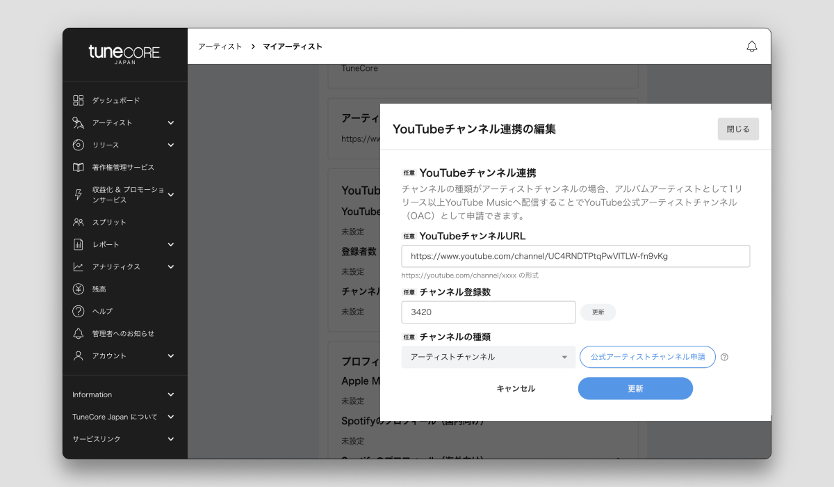 - アーティスト登録情報内「YouTubeチャンネル」の鉛筆マークを押してチャンネルの種類で「アーティストチャンネル」を選択して更新ボタンをクリック(※レーベルチャンネル、メディアチャンネルはOAC対象外です)