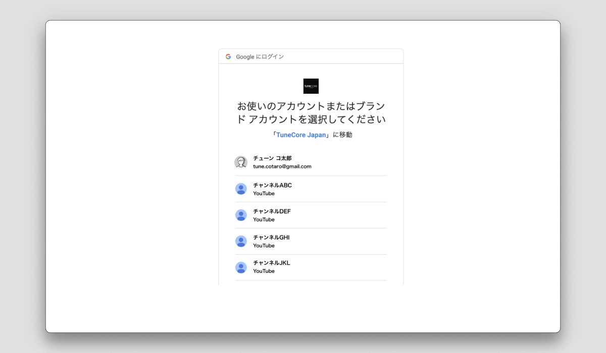 - 申請するYouTubeチャンネルのGoogleアカウントにログインの上、チャンネルを選択