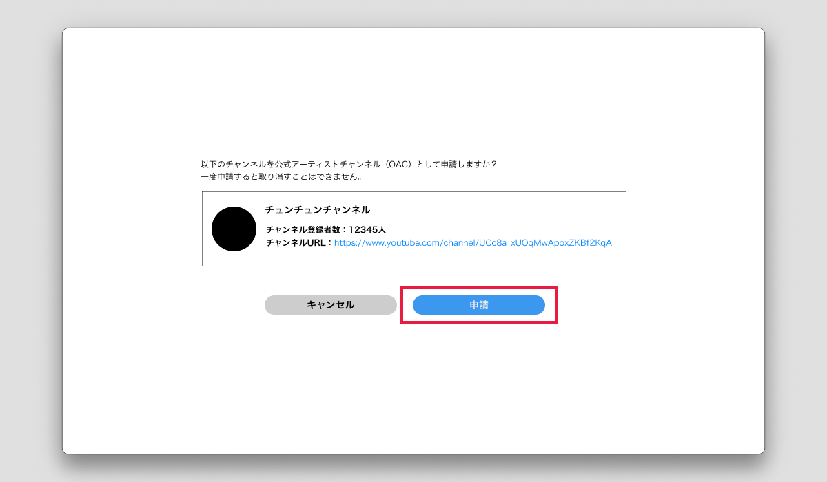 - チャンネル名など申請情報を確認し「申請」をクリック